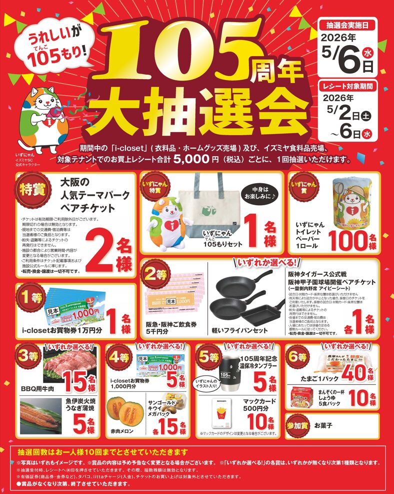 条件: 期間中の「i-closet」(衣料品・ホームグッズ売場)及び、イズミヤ食料品売場、対象テナントでのお買上レシート合計5,000円(税込)ごとに1回抽選できます。