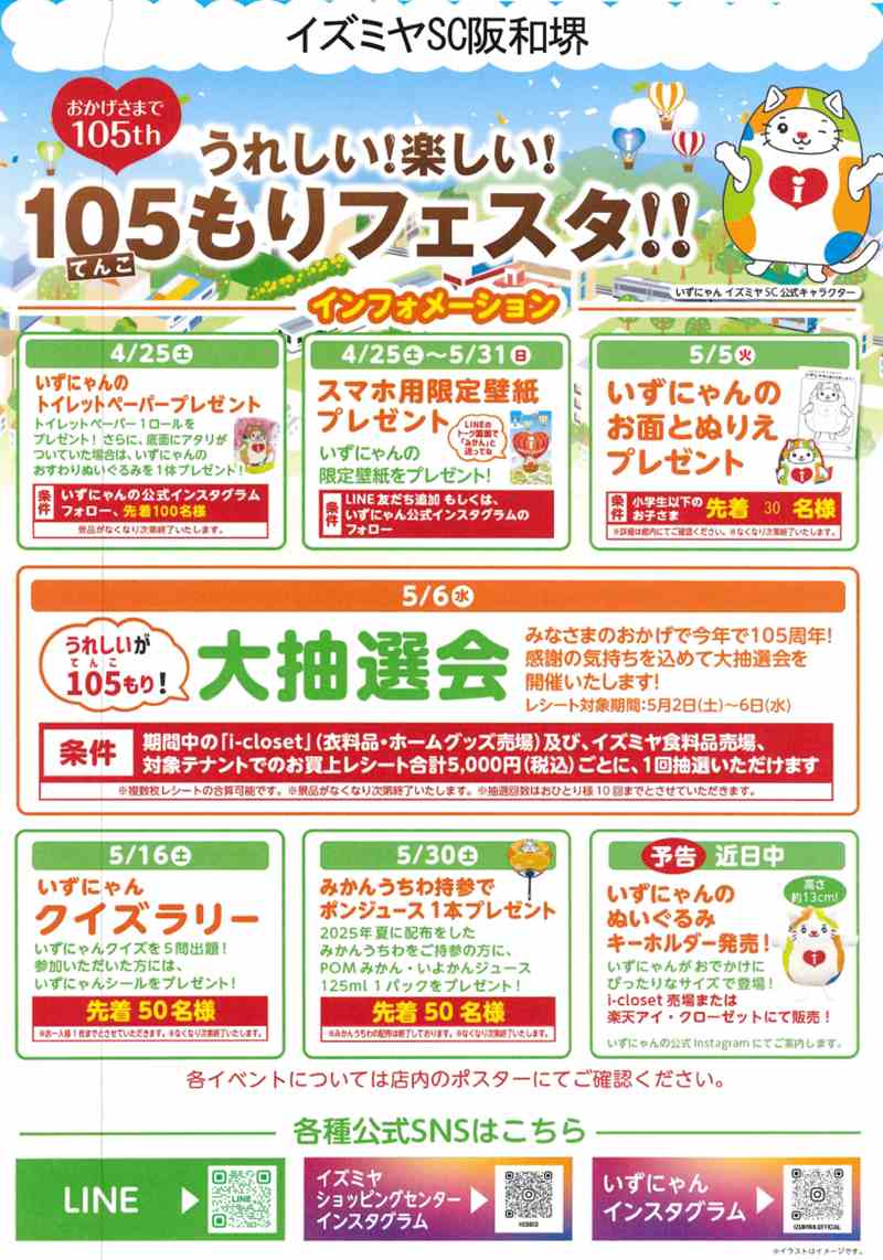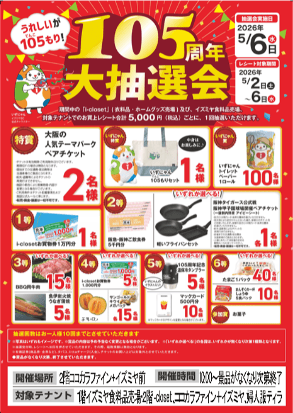なんと、イズミヤ創業105周年を記念して、とってもお得で楽しいイベント「うれしい!楽しい!105(てんこ)もりフェスタ!!」が開催されます!