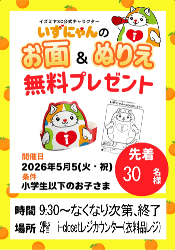 5/5(火)はこどもの日にちなんでイズミヤショッピングセンター公式キャラクター『いずにゃん』のおめん&ぬりえを小学生以下のお子さまに無料でプレゼント!