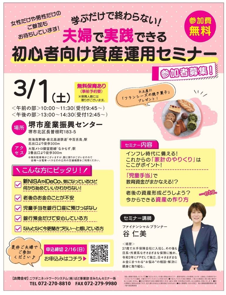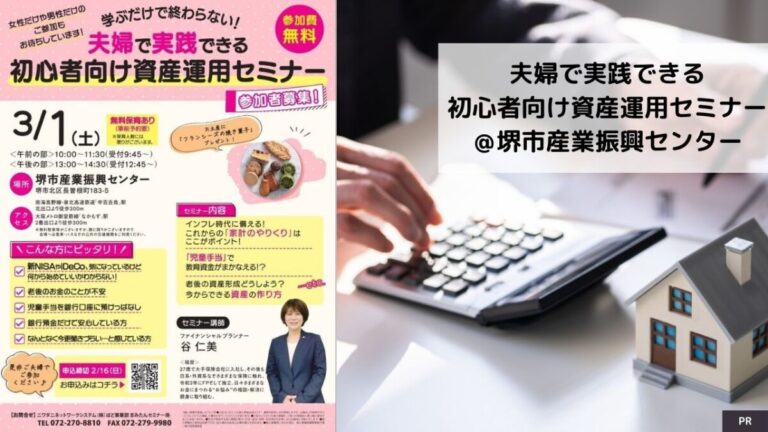 3/1(土)に堺市北区の堺市産業振興センターで開催される「学ぶだけで終わらない!夫婦で実践できる初心者向け資産運用セミナー」の参加者を募集中です!