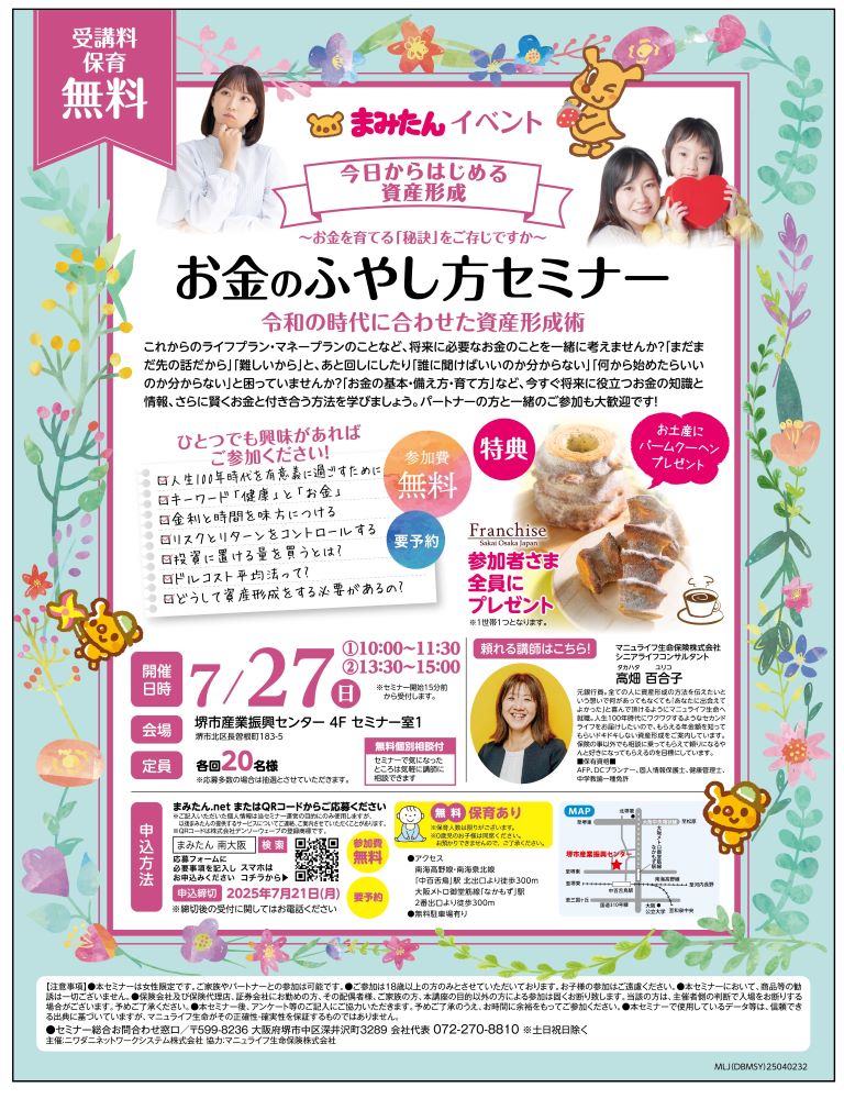 2025年7月27日(日)に、堺市北区・堺市産業振興センターにて「今日からはじめる資産形成 ~お金を育てる「秘訣」をご存じですか~ お金のふやし方セミナー」が開催されます!