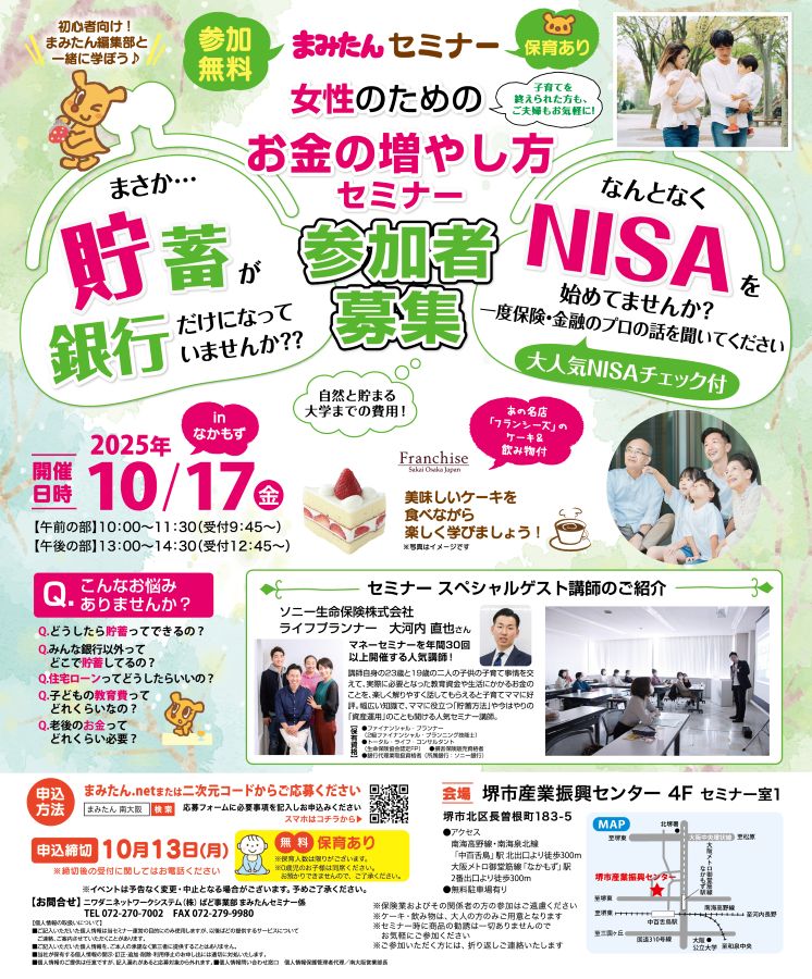 堺市北区の堺市産業振興センターにて、2025年10月17日(金)に、地域密着の子育て情報誌「まみたん」とコラボした無料マネーセミナー「女性のための お金の増やし方セミナー」が開催されます。
