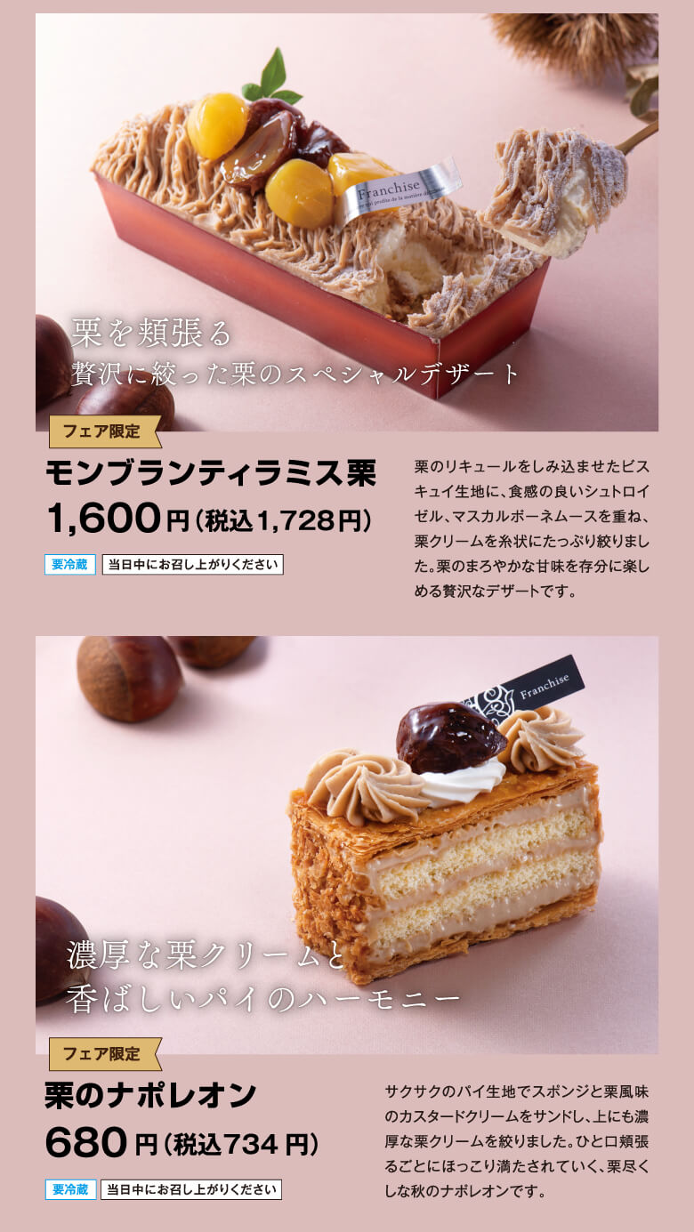 贅沢に絞った栗のスペシャルデザート「モンブランティラミス栗」や濃厚な栗クリームと香ばしいパイのハーモニーで満たされる「栗のナポレオン」