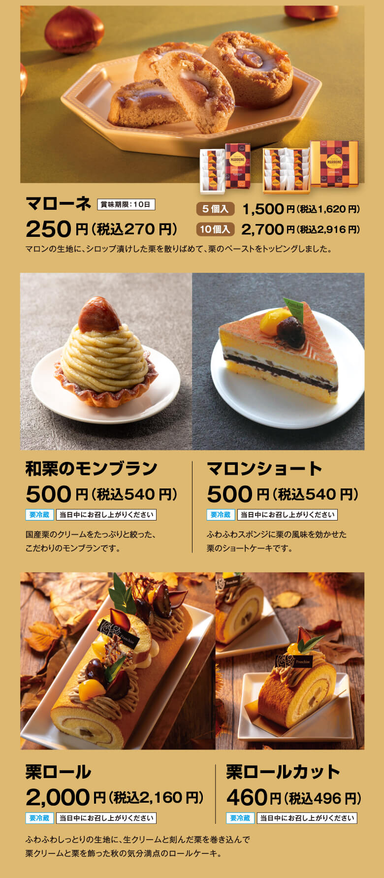 他にも、和栗のモンブラン、マロンショート、栗ロール。