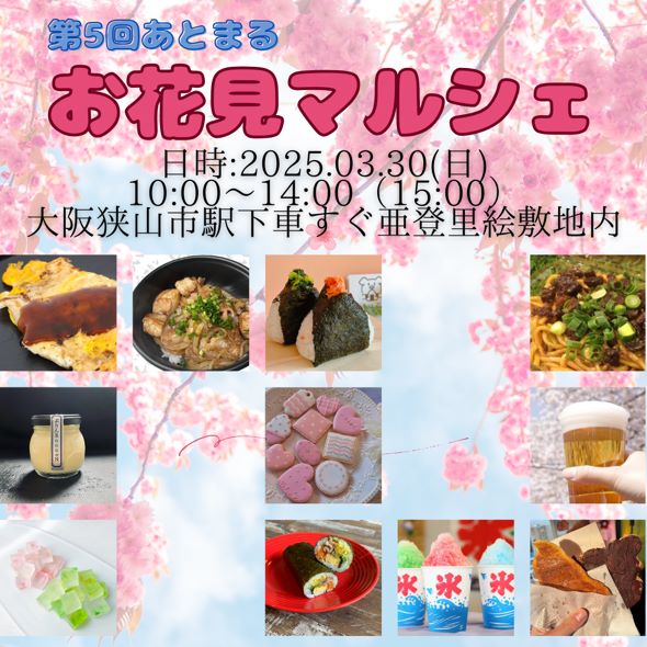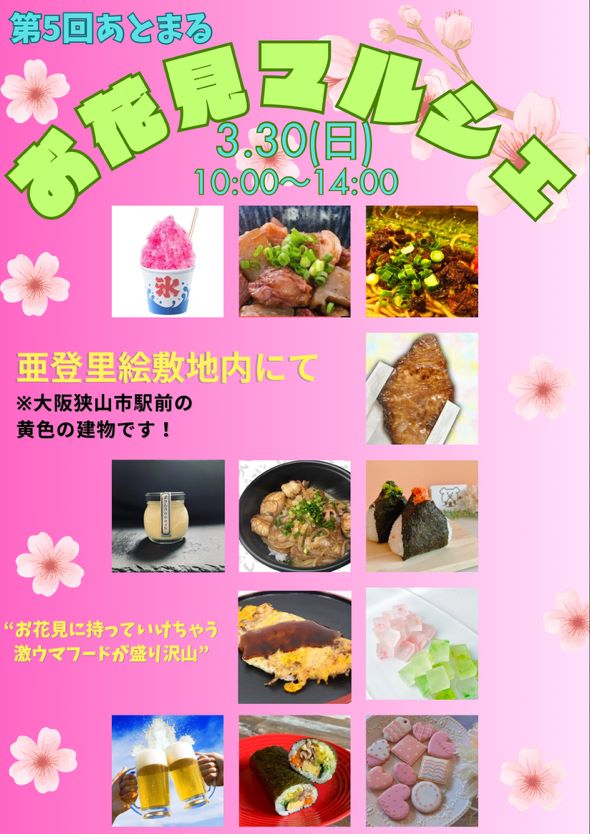 3月30日(日)に、大阪狭山市駅下車すぐ黄色の喫茶店「クルンジカフェ亜登里絵(アトリエ)」敷地内にて「第5回あとまる お花見マルシェ」が開催されますよ~!