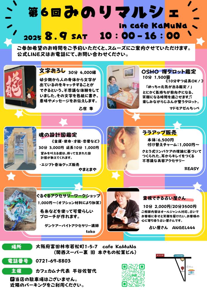 文字おろしやぐるぐるアクセサリーワークショップ、禅タロット鑑定、魂の設計図鑑定など、癒しと発見のひとときを過ごせる、「みのりマルシェ」ならではのブース展開!