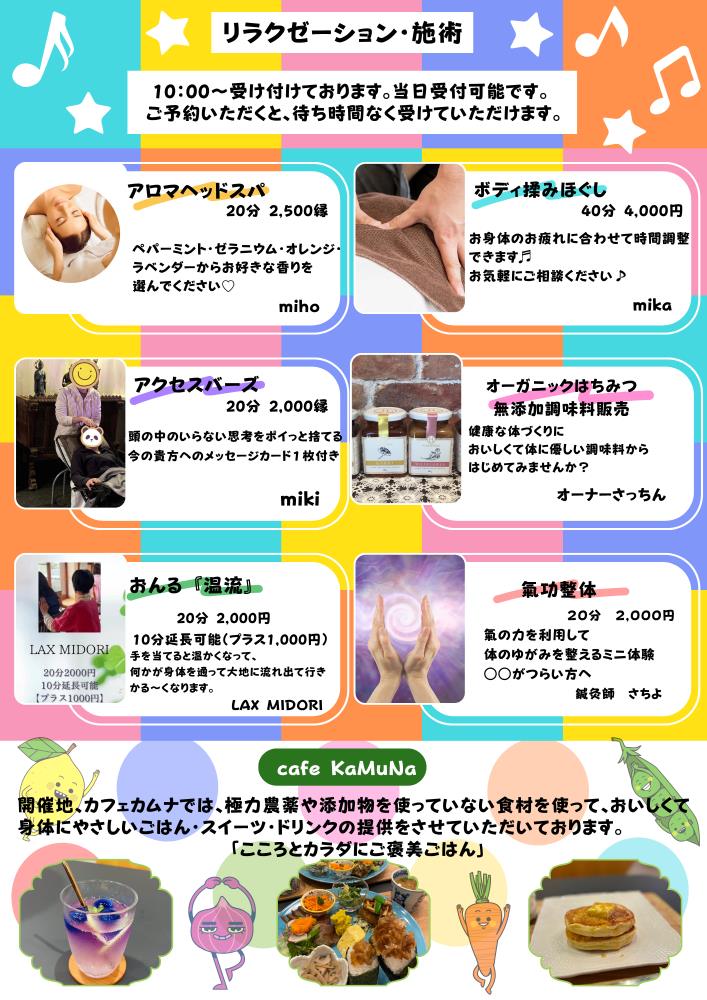 アロマヘッドスパやボディ揉みほぐし、アクセスバーズといったリラクゼーションのブースもありますよ♪