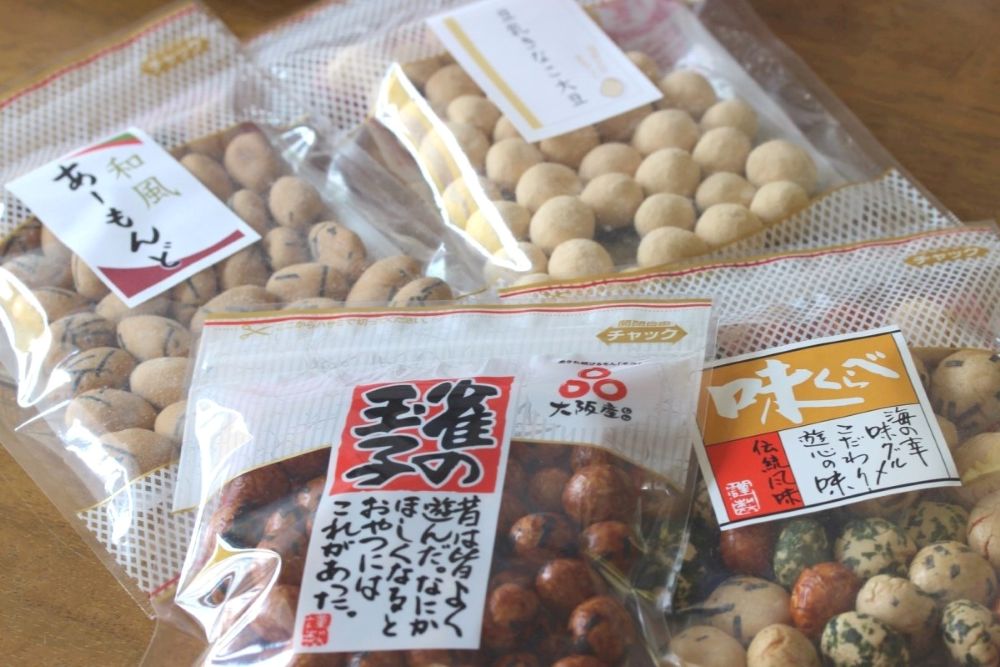昔ながらの醤油味の豆菓子「雀の玉子」をはじめ、抹茶やむらさきいも、コーヒーや黒こしょう、山椒などを使った豆菓子を販売。