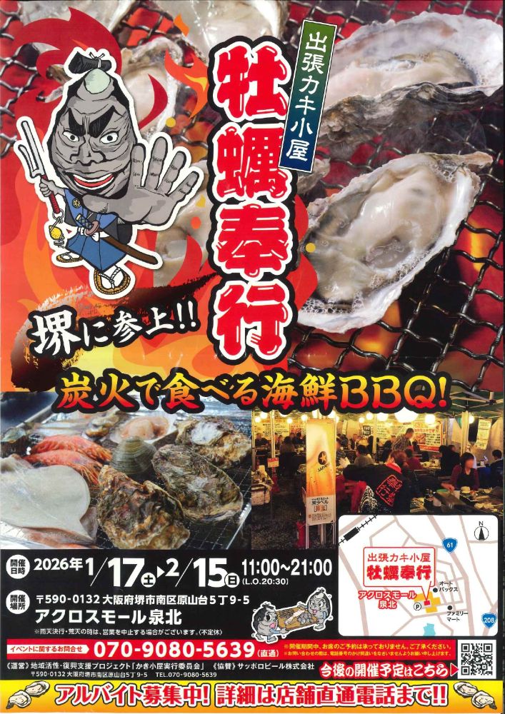 堺市南区・アクロスモール泉北に、「出張カキ小屋 牡蠣奉行」がやってきます!