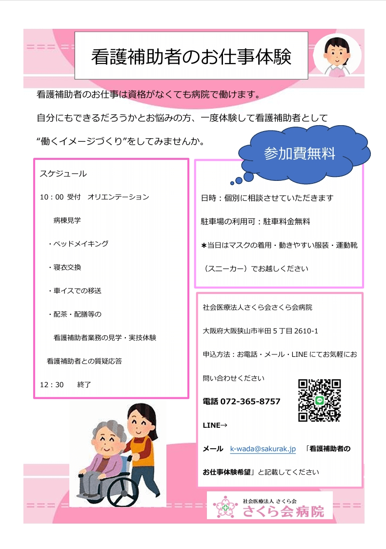 大阪狭山市の社会医療法人さくら会 さくら会病院で看護補助者のお仕事体験を実施中です!