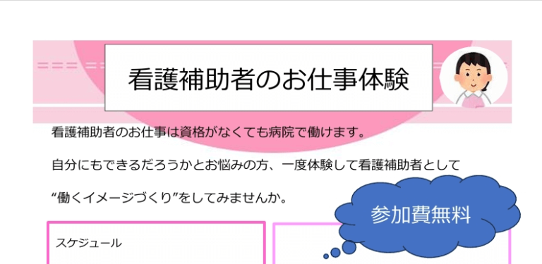このイベントでは実際の業務の見学・実技体験ができて、看護補助者の先輩に質問する機会もあるので、そんな不安や疑問も解消できますね!