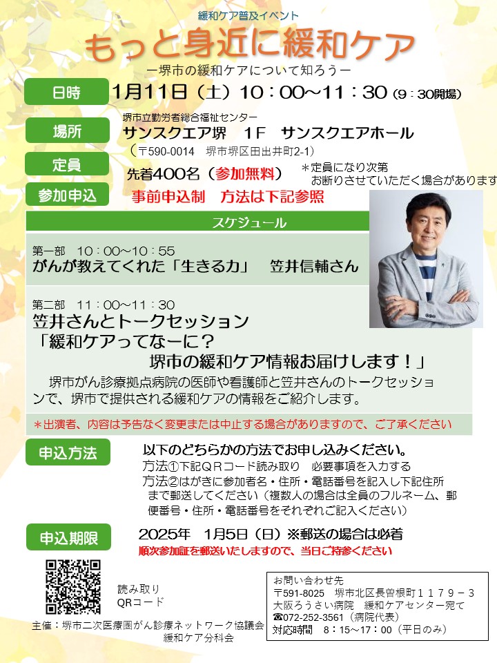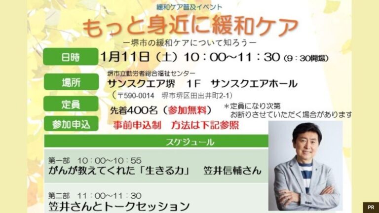 2025年1月11日に、堺市堺区のサンスクエア堺で、緩和ケアの普及イベントが開催されます。