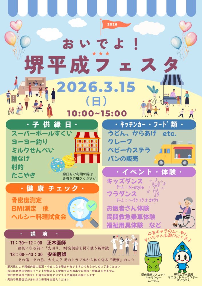 食べて遊んで健康に!家族やお友達と、ぜひ堺平成フェスタへ遊びに行ってみてください!