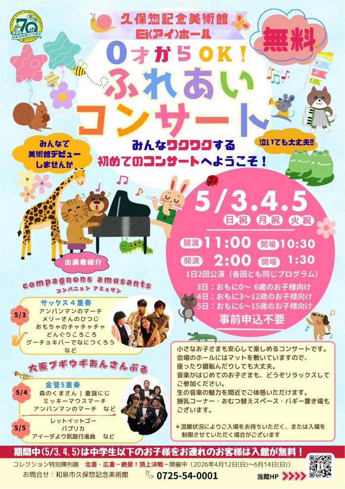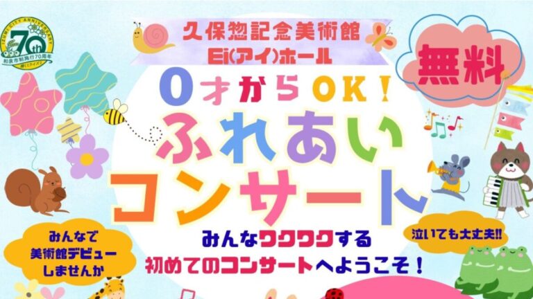 和泉市久保惣記念美術館の市民ホール(Eiホール)にて、『0才からOK! ふれあいコンサート』が2026年5月3日(日祝)・4日(月祝)・5日(火祝)の3日間開催されますよ♪