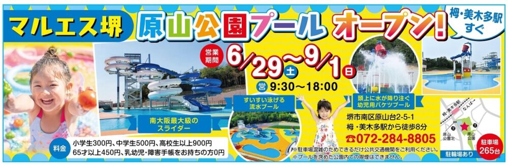 一昨年オープンした栂・美木多駅から徒歩8分、原山公園内にあるマルエス堺 原山公園プールが6/29(土)~利用できます!