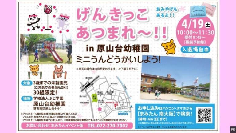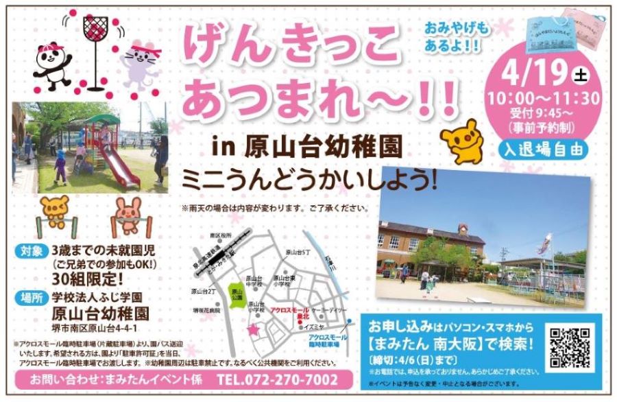 4月19日(土)に、堺市南区にある原山台幼稚園で「げんきっこあつまれ~!!ミニうんどうかいしよう!」が開催されます!