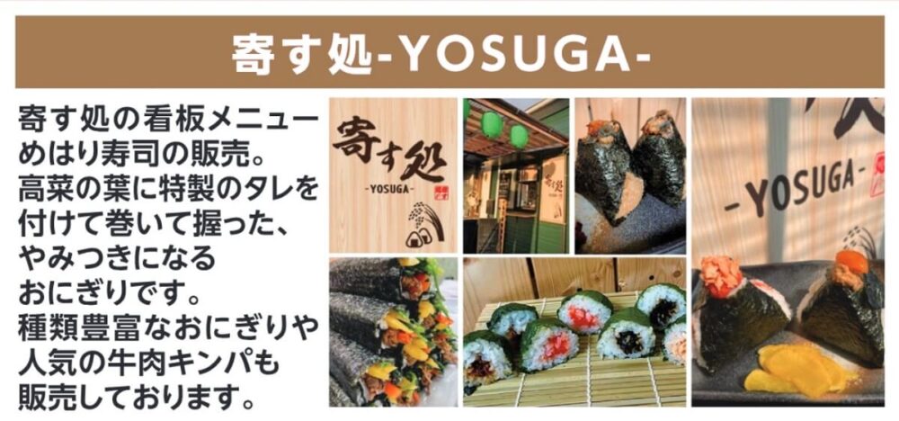 寄す処の看板メニュ-めはり寿司の販売。他にも種類豊富なおにぎりや人気の牛肉キンパを販売致します。