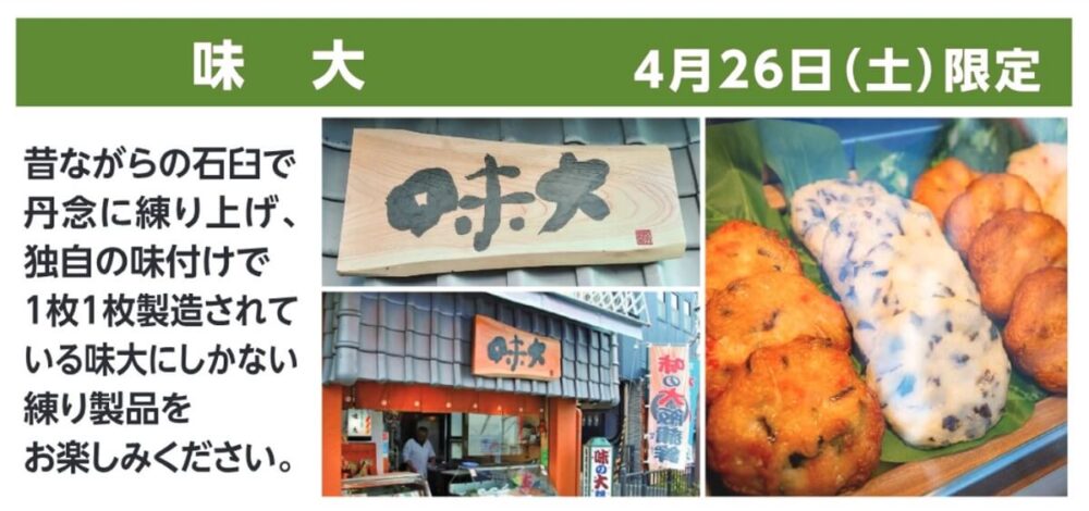 石臼で丹念に練り上げ独自の味付けで1枚1枚製造されている味大にしかない練り製品の販売。