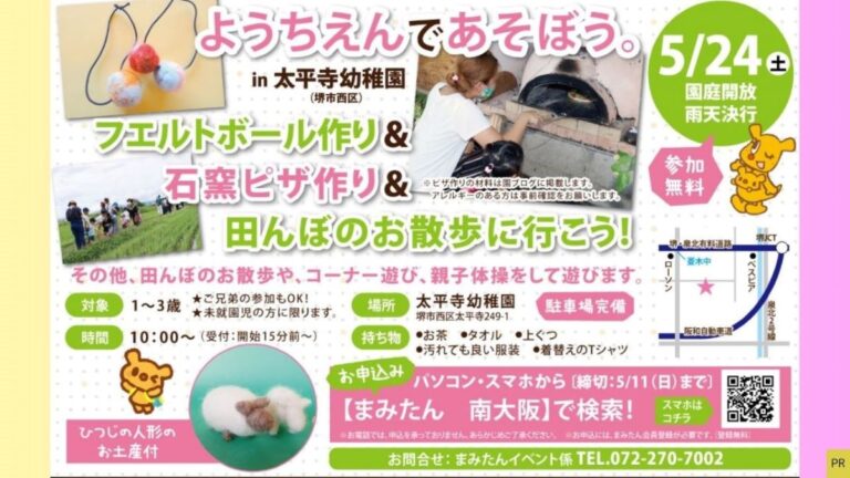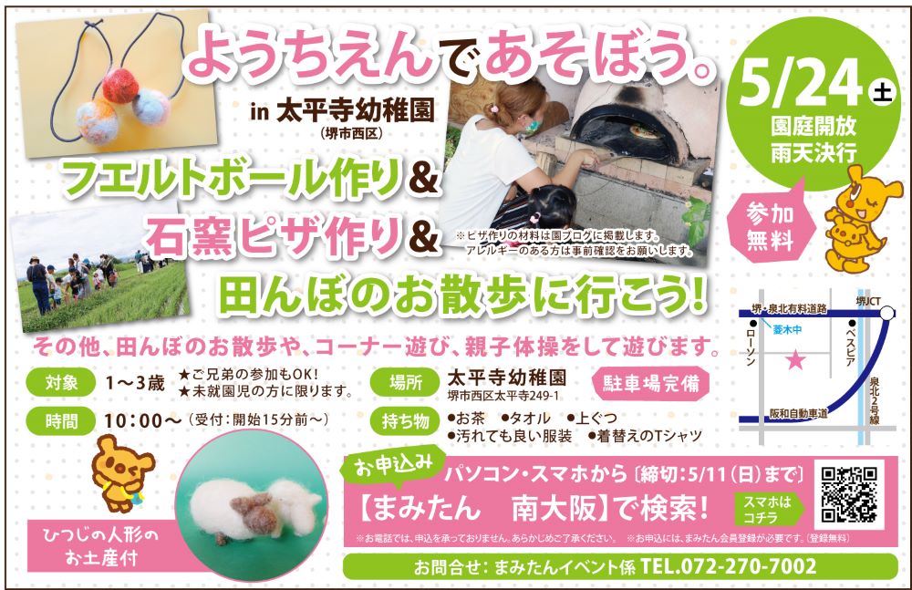 場所:太平寺幼稚園(堺市西区太平寺249-1)※駐車場完備、雨天決行、園庭開放