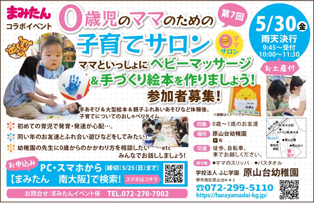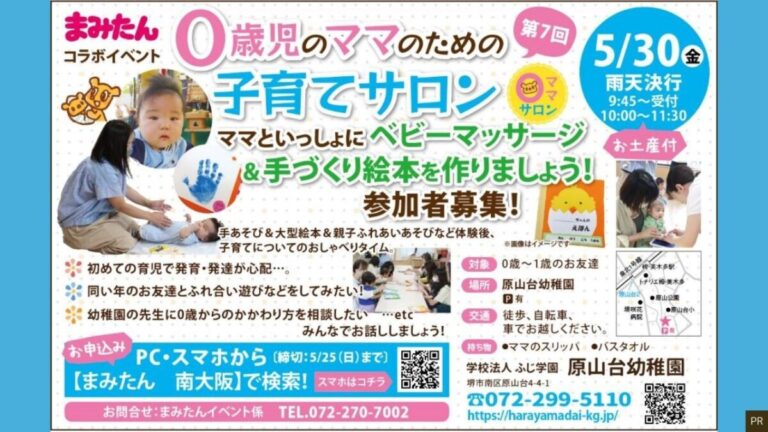 5月30日(金)に、0歳児ママのための子育てサロンが、堺市南区・原山台幼稚園で開催されますよ!
