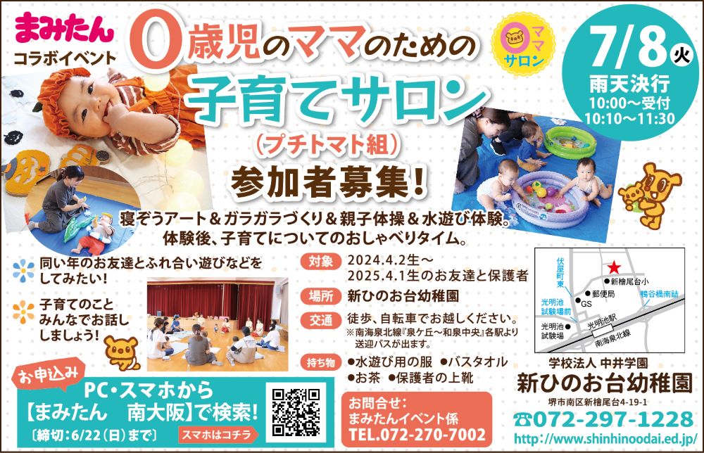 2025年7月8日(火)に、堺市南区「新ひのお台幼稚園」にて「0歳児のママのための子育てサロン(プチトマト組)」が開催されます!