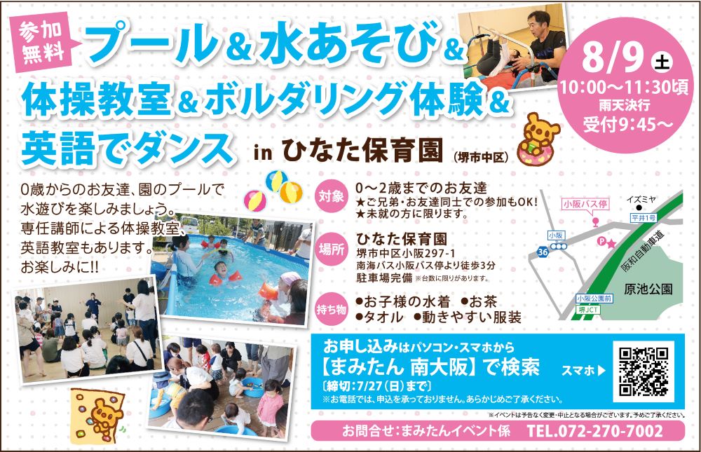2025年8月9日(土)、堺市中区の「ひなた保育園」で子育てイベント『プール&水あそび&体操教室&ボルダリング体験&英語でダンス』が開催されます!