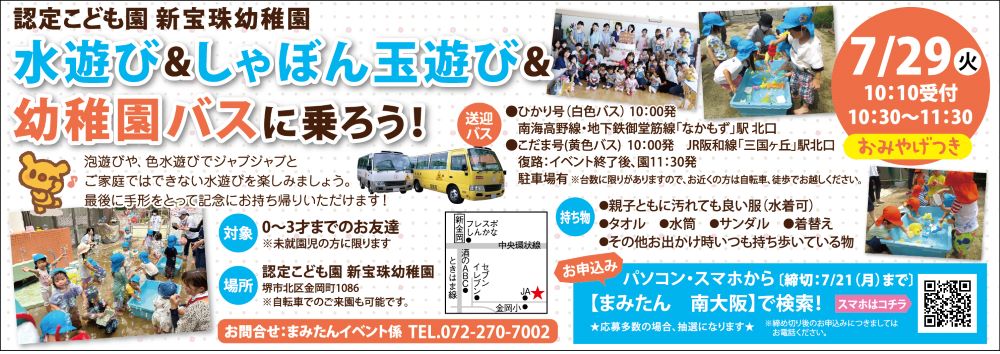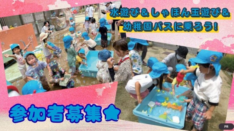 堺市北区にある「認定こども園 新宝珠幼稚園」にて、子育てイベント「水遊び&しゃぼん玉遊び&幼稚園バスに乗ろう!」が開催されます!
