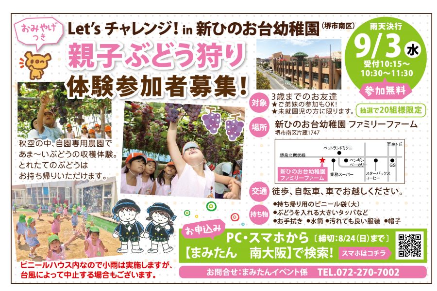 9月3日(水)、堺市南区の新ひのお台幼稚園にて、親子ぶどう狩り体験が開催されます♪