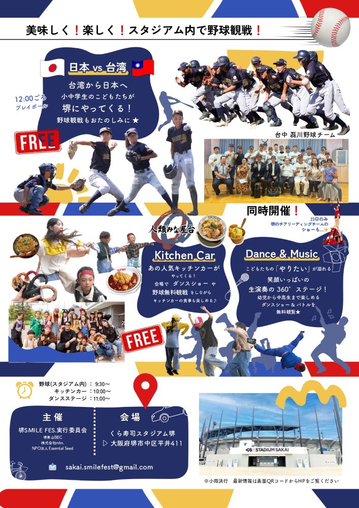 この堺のキッズ向けイベントは、グルメやダンスステージなどお楽しみが盛りだくさんの2日間。注目は、台湾の小中学生野球チームとの交流戦です!