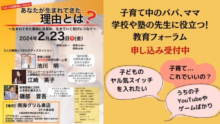 堺市堺区「南海グリル」にて、子育て中のパパママや教育関係者に向けた教育フォーラムが開催されます。(主催:ひみつの図書館 in SAKAI)
