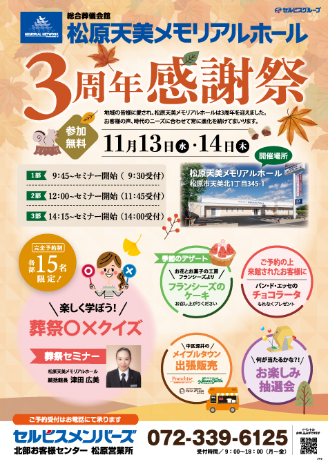 松原天美メモリアルホールにて3周年感謝祭が開催されます!