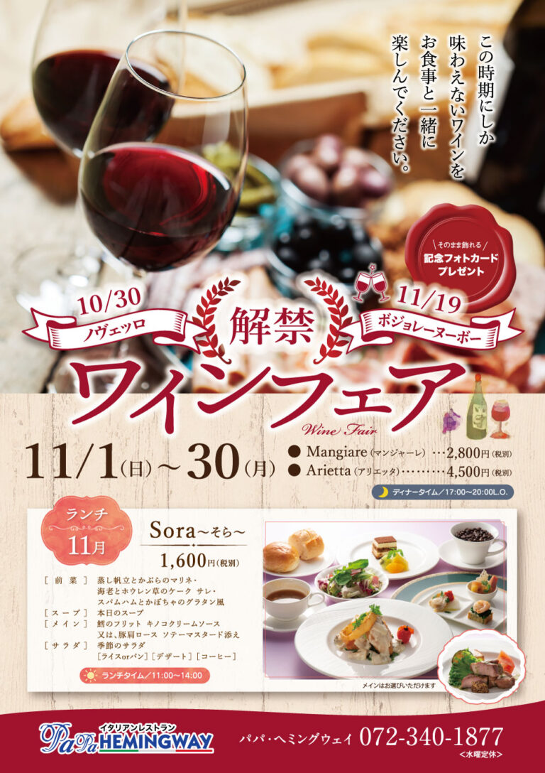 サンパレス2階のイタリアンレストラン「パパ・ヘミングウェイ」では11月の間、ワインフェアを開催中!