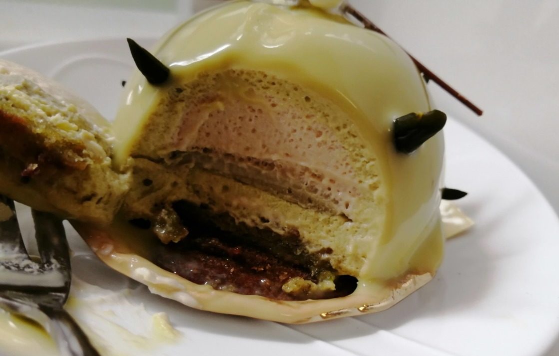 上から順にピスタチオのグラサージュ・ピスタチオのムース・黒糖ショコラのクリーム・ピスタチオガナッシュ・ピスタチオのビスキュイ・黒糖キャラメル