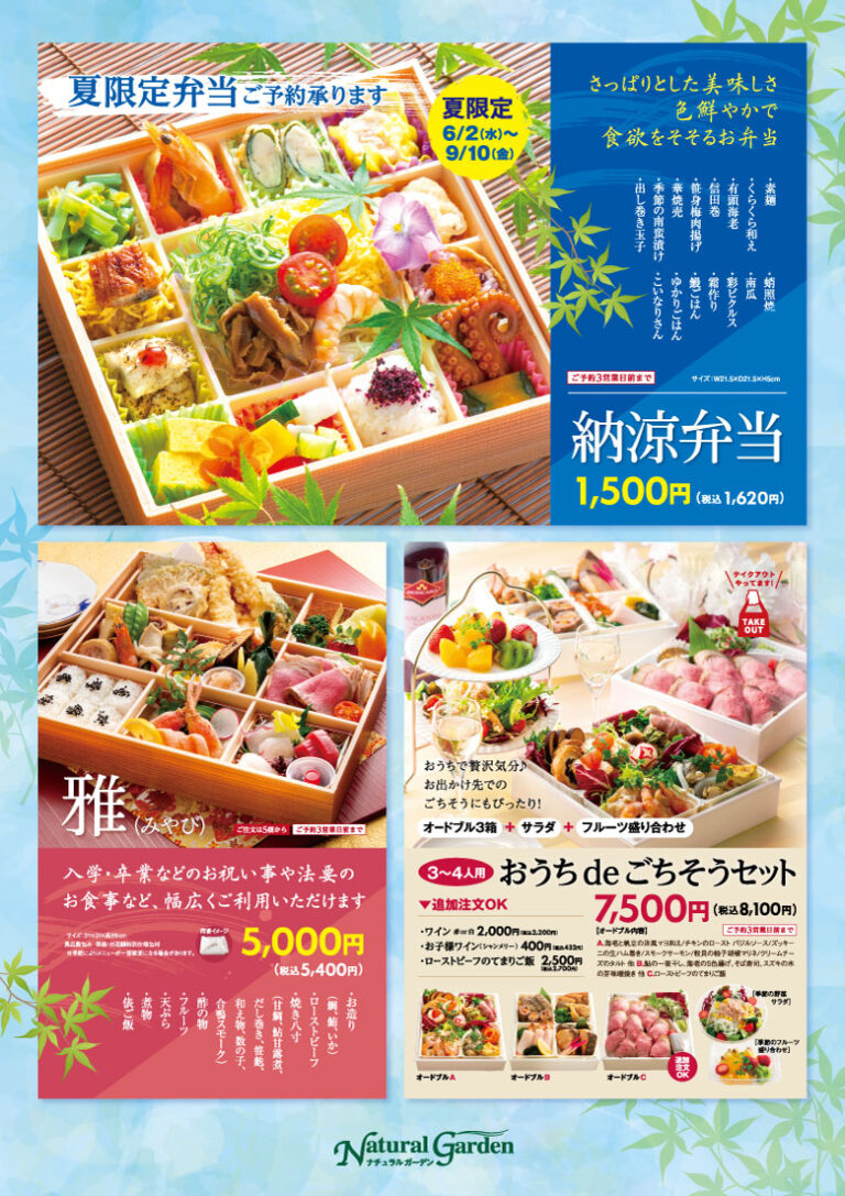 納涼弁当以外にもナチュラルガーデンでは、お祝いごとや法要のお食事に幅広く使える「雅」、おうちパーティーに便利なごちそうセットなどもご用意が可能です。