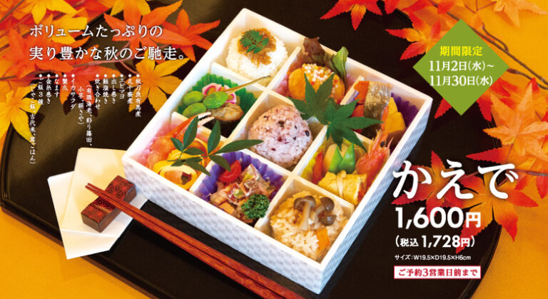 秋の行楽のお供にぴったり。大切な方へのおもてなしのお弁当として、集会や会議後の懇親会の食事としても喜ばれそうです。
