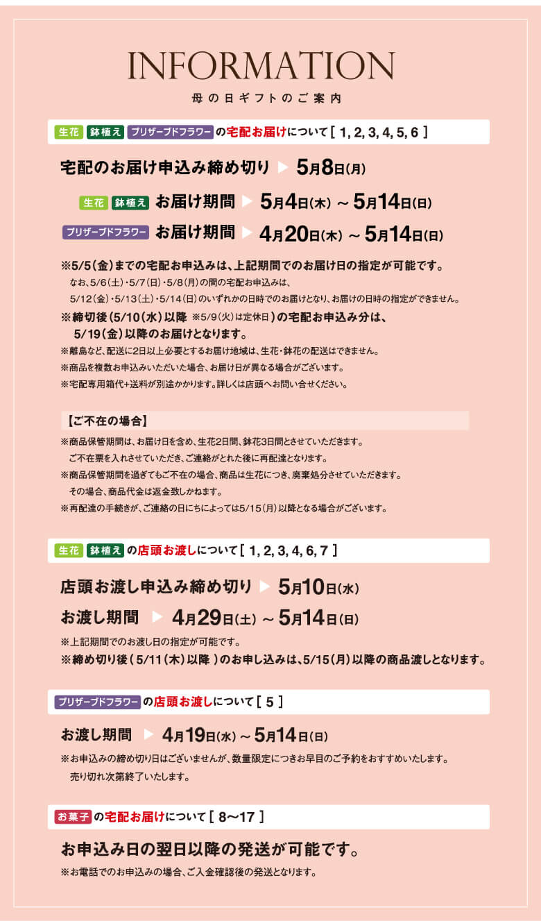 堺市中区の『花とお菓子の工房 フランシーズ』では、母の日の贈り物にぴったりなスイーツやお花がラインナップされています。