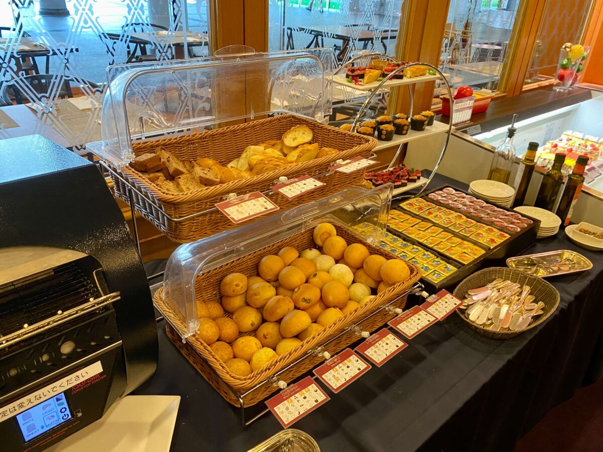 ホテルメイドの焼きたてパンが並ぶパンコーナー。種類も豊富です。