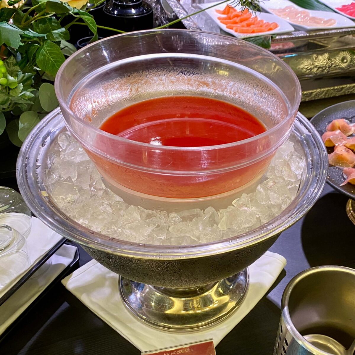 トマトのガスパチョ魚介やお肉の種類もたくさん。あちこちでいい香りが漂っていますよ〜。