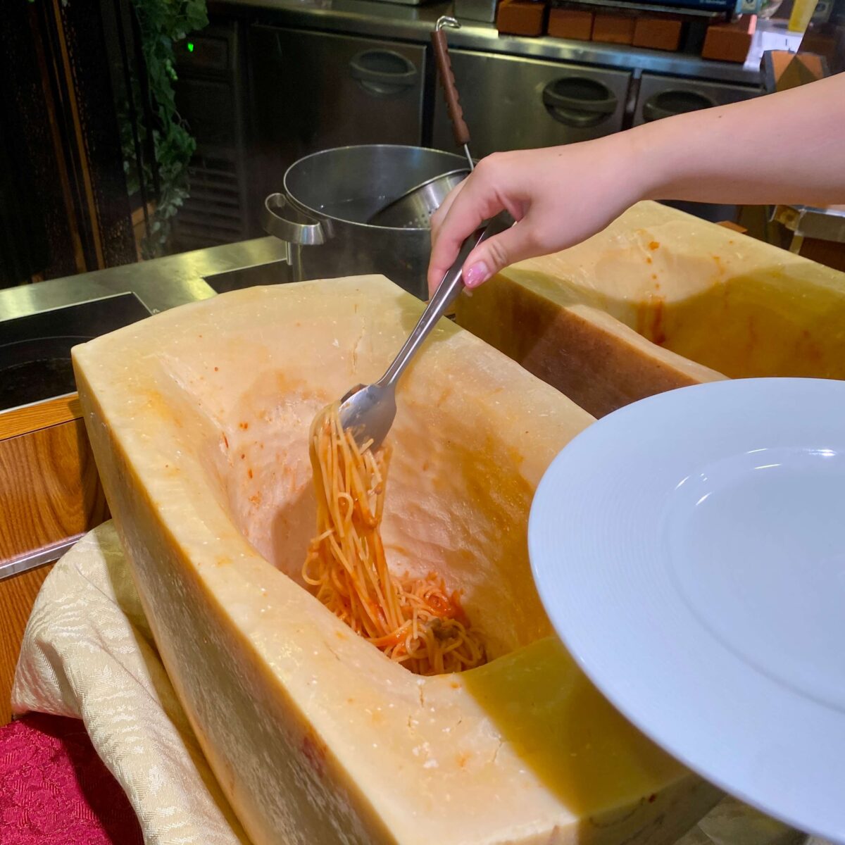 出来立てアツアツのパスタをチーズにからめて…。ん〜、たまらない。