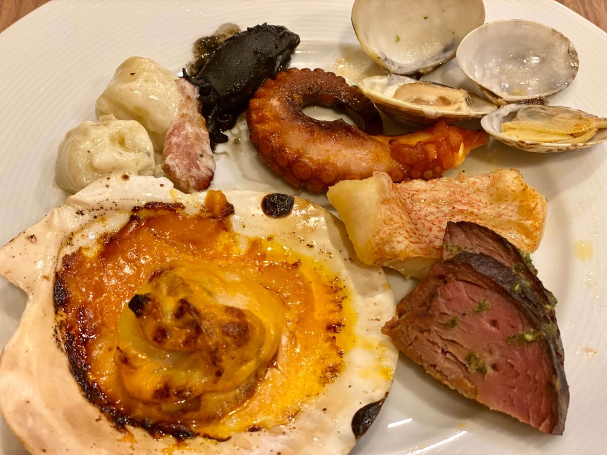 烏賊の墨煮/蛸のトマトソース煮/蛤のマリニエール/帆立貝のグラタン/さざえの壺焼き紫蘇風味/白身魚とあさりのドライトマトとオリーブ風味/じゃが芋のニョッキ/ポークスペアリブ/仔羊モモ肉のロースト ラタトゥイユ添え/チキングリル/焼売