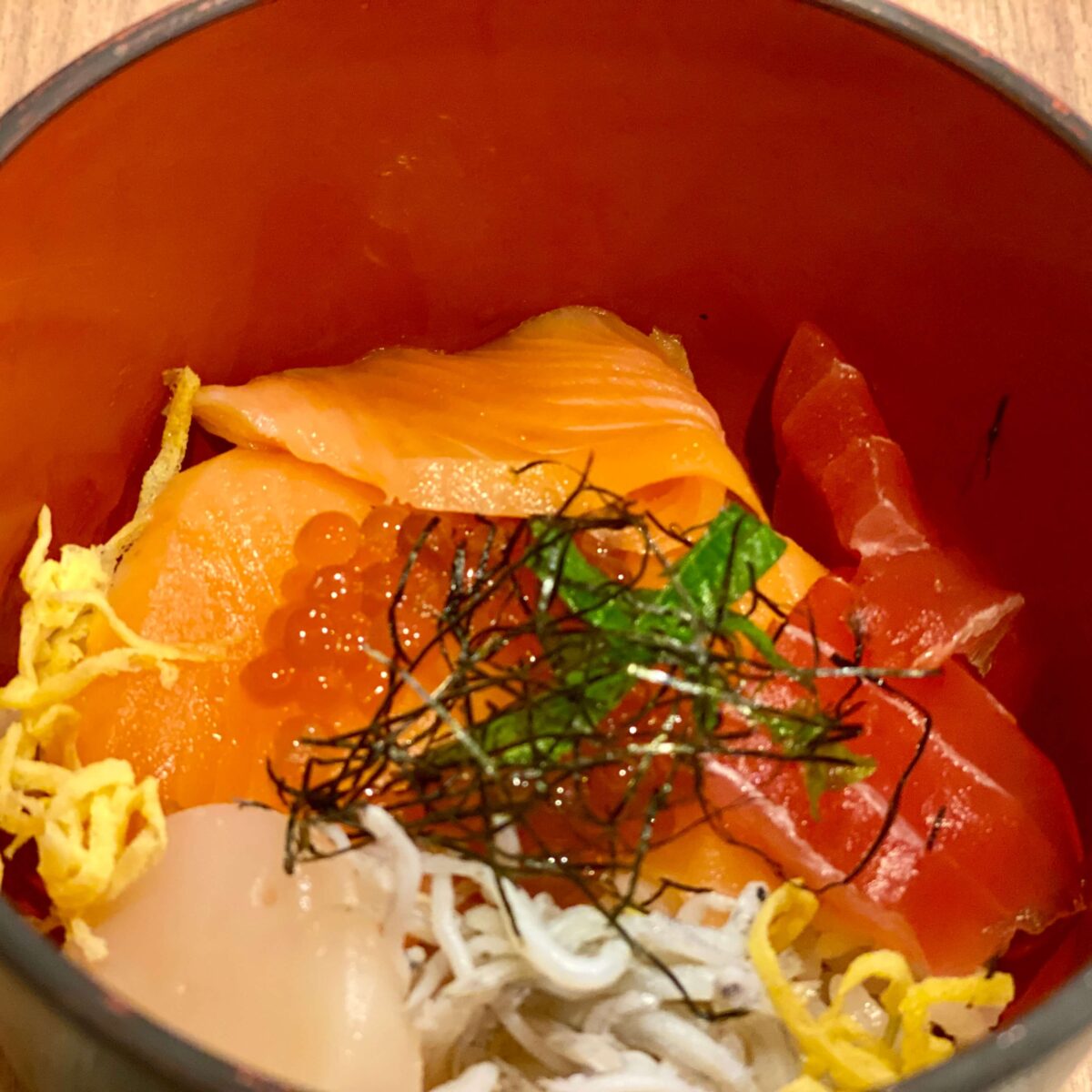 【海鮮丼】大葉/胡麻/針海苔/鮪/いくら/烏賊/帆立貝/サーモン/茹でしらす/出汁醤油
