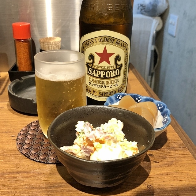 赤星中瓶650円と付き出し330円のポテサラとこんにゃく。
