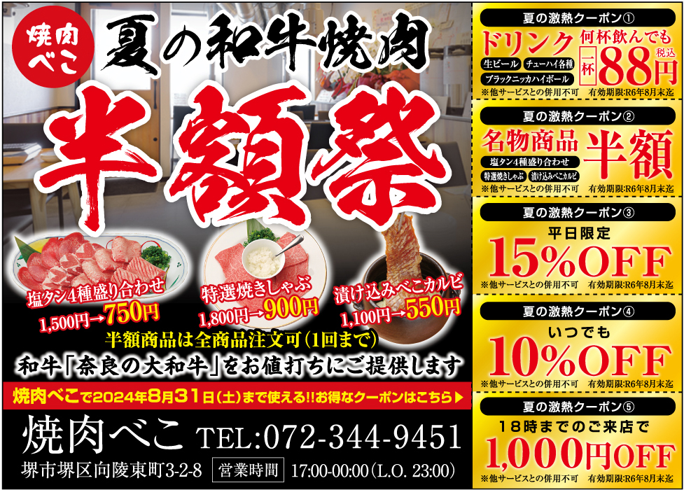 堺市堺区『焼肉べこ』にて夏の和牛焼肉半額祭がスタート!