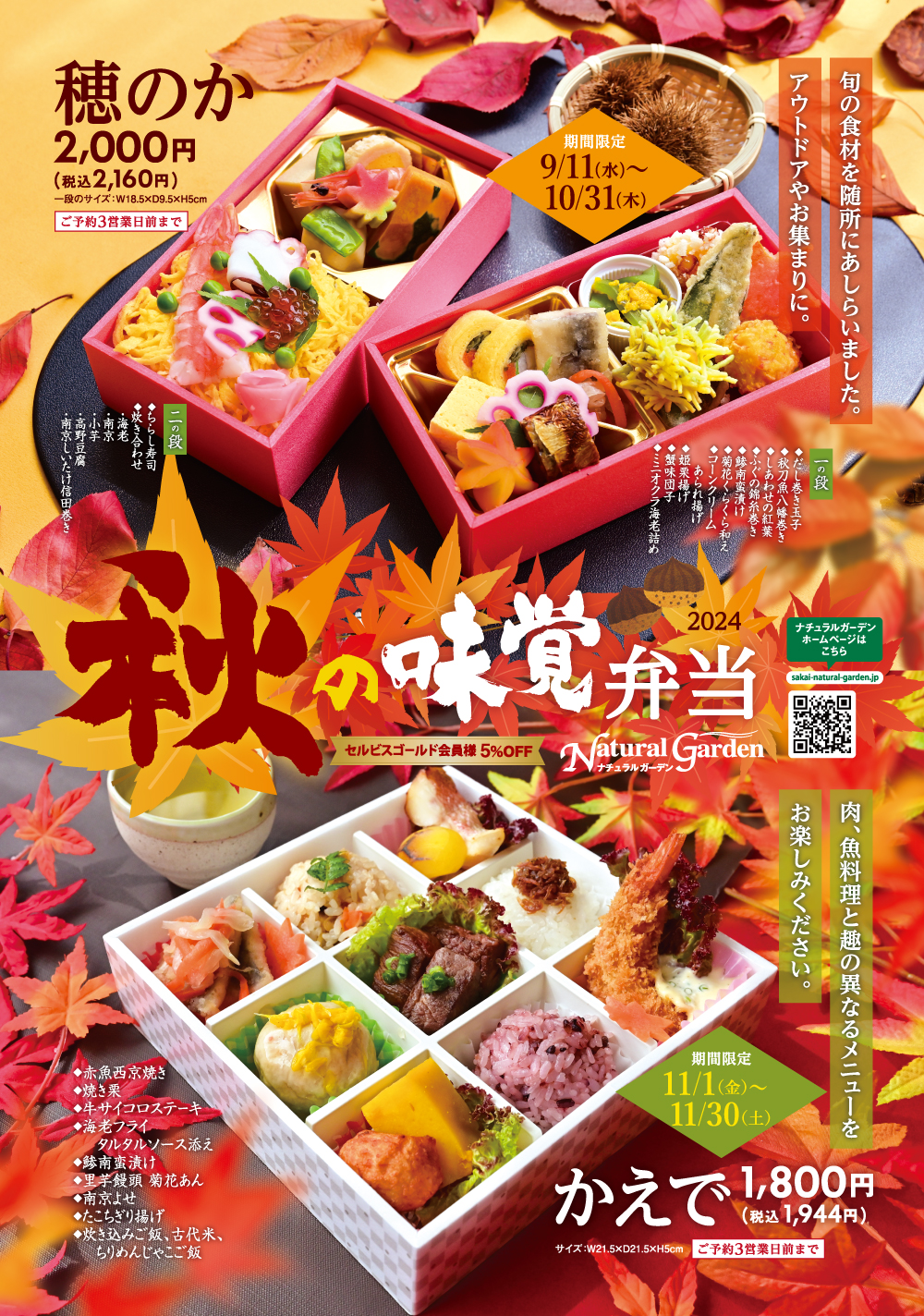 堺市中区のナチュラルガーデンでは、毎年ご好評!秋の味覚弁当『穂のか』を販売中です。