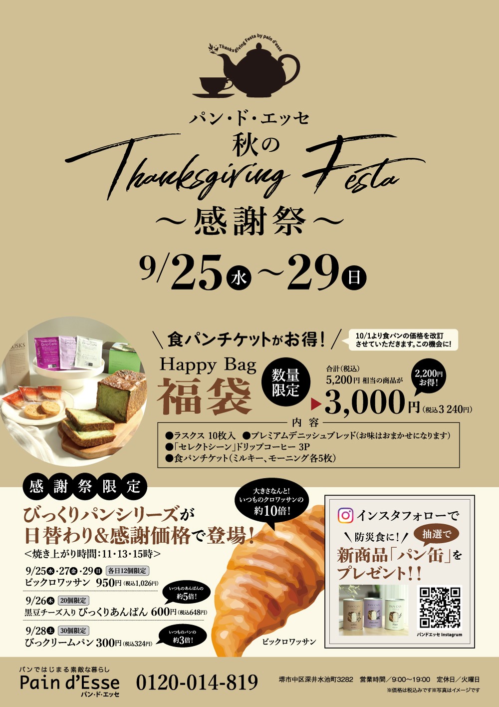 堺市中区の「パン・ド・エッセ」では、9月25日(水)から29日(日)までの5日間、日頃の感謝を込めた特別な〖 感謝祭 〗が開催されます!