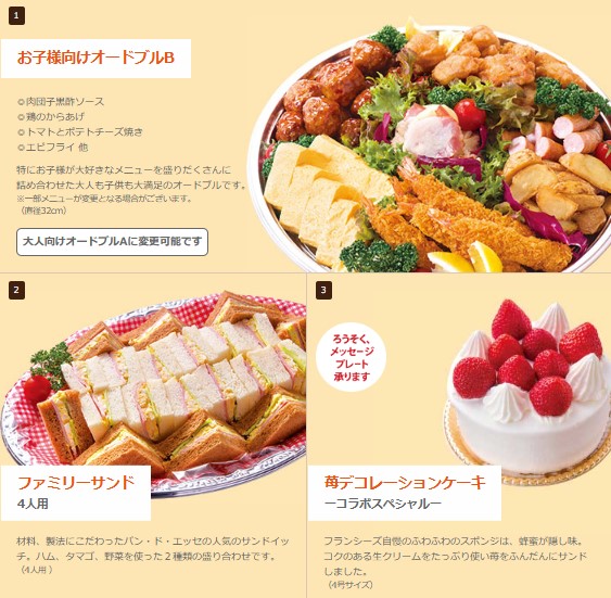 ※各ショップの休日及び、クリスマス時期(12/20〜1/10)はこちらのパンフレットのパーティセットはご予約いただけません。あらかじめご了承ください。