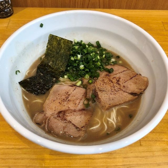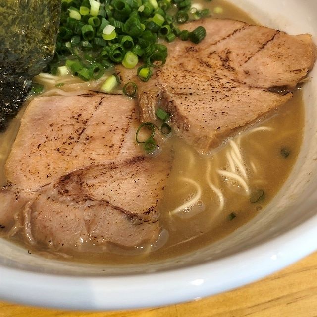 炙りチャーシュー2枚とネギと海苔が乗っています。