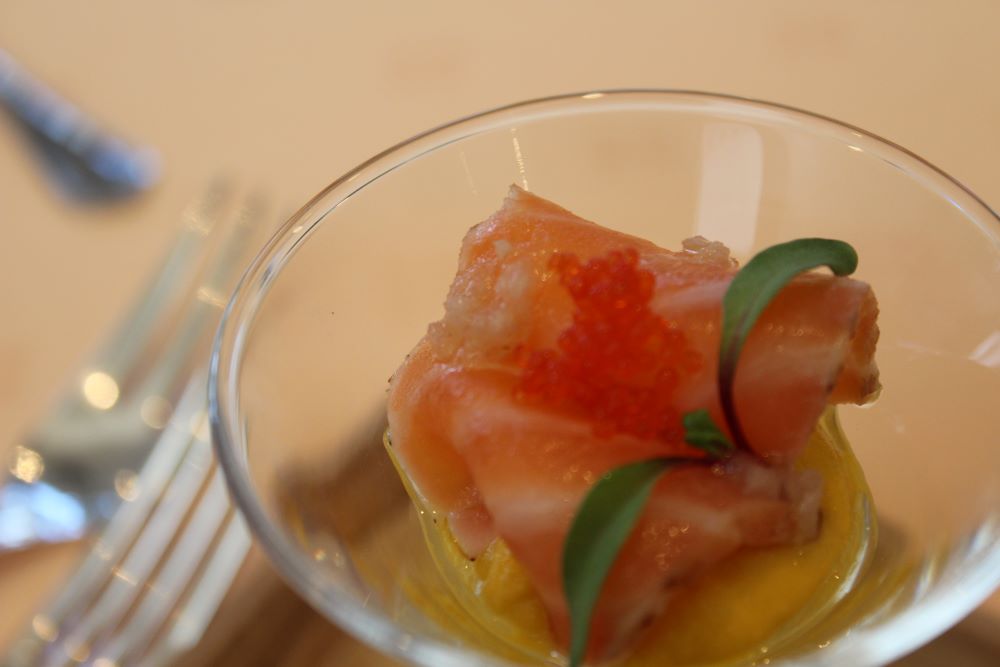 下のソースは、時間をかけて炒めた人参のピューレと玉ねぎに生クリームをプラスしてクリーミーに仕上がっています。