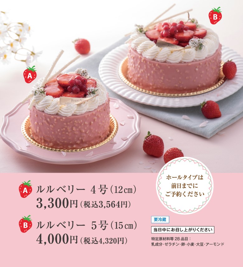 甘酸っぱいフリュイルージュのムースで苺ジュレ、クレームココを包み込み、側面にアーモンド入りの苺チョコをあしらいました。苺の甘酸っぱさとココナッツのマイルドな甘さが軽やかにマッチしています。お花や苺を飾った春感いっぱいの苺スイーツです。