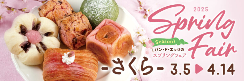 春の訪れを告げる「さくら」をテーマにしたパン・ド・エッセのスプリングフェアが開催! 期間限定の特別なパンやスイーツをお楽しみください。